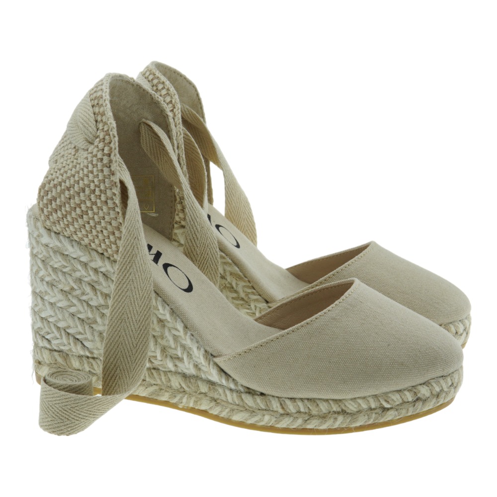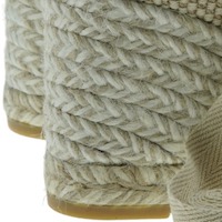Elige estas alpargatas de cuña de yute ecológico de la marca GAIMO . El interior es de piel y plantilla acolchada para mayor comodidad. El cierre es mediante una cinta de algodón alrededor del tobillo para mayor agarre. La altura de la cuña es de 9 cm y la plataforma de 1,7 cm aproximadamente.