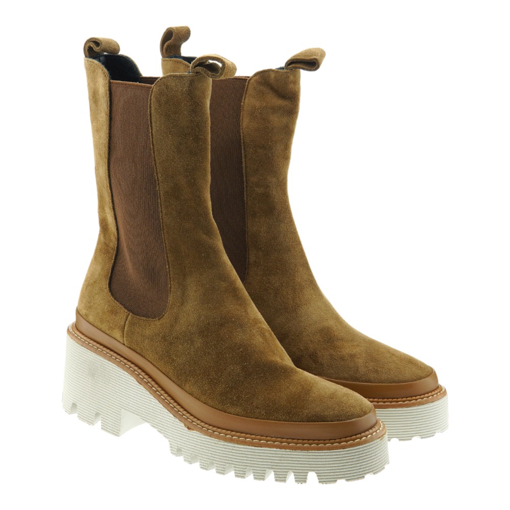 Piel de nobuck color cacao. Consejos de talla: Calzan el número. Los botines Chelsea tienen la ventaja de que se ajustan a la perfección gracias a los elásticos de la caña. Estas botas las llevaremos este invierno a diario por su comodidad, ya que la cuña tiene la altura perfecta para todos los días.