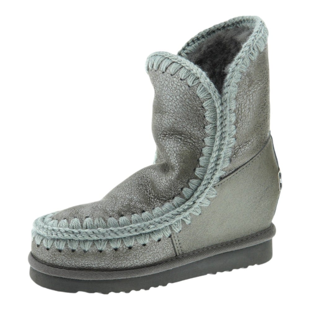 Esta bota es un icono de MOU, fabricada en piel metalizada y con cuña interior para mayor confort. Están forradas de piel de oveja auténtica, lo que mantiene la temperatura y nos protege del frío y por la parte de fuera, está decorada con pespuntes hecho a mano de lana. Cuña de 5 cm aproximadamente.