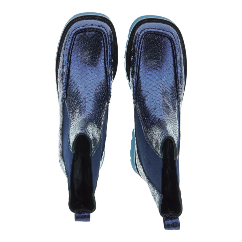 Piel metalizada azul. Consejos de talla: Calzan el número. Estas botas son perfectos para llevar de diario. Un estilo único y elegante para combinar con un vestido o con un pantalón de vestir y una camisa para ir a trabajar.