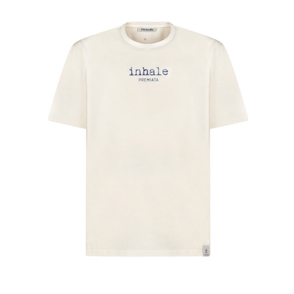 Camiseta Premiata blanca con el mensaje “inhale/exhale” en bordado azul. Un diseño limpio y elegante con esencia contemporánea.