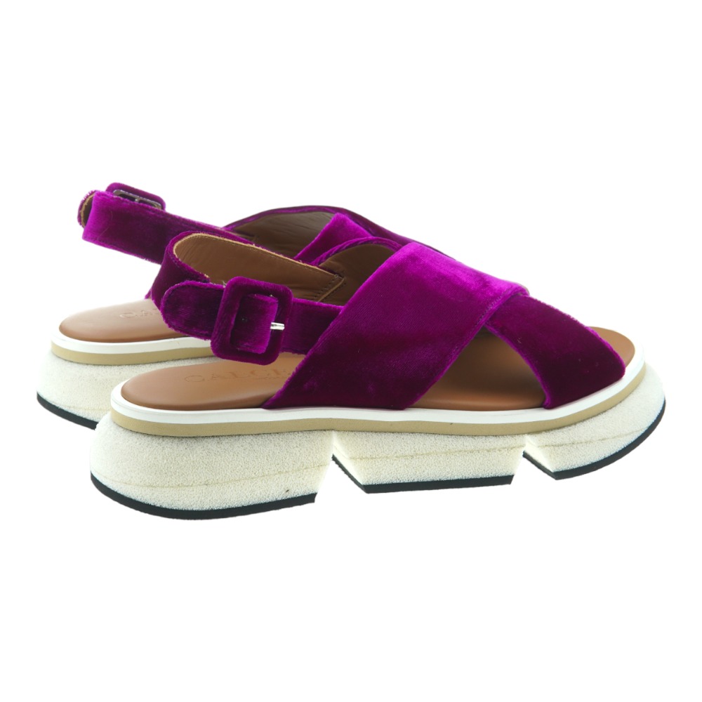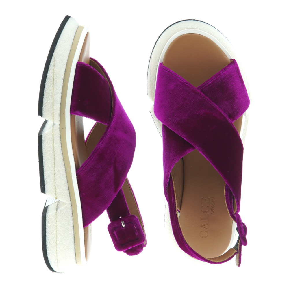 Estas sandalias de mujer de la marca CALCE son ideales para diario por su estilo y comodidad. El diseño tiene dos tiras cruzadas en el empeine de terciopelo con tira en el talón y hebilla y plataforma de goma. El interior es de piel.