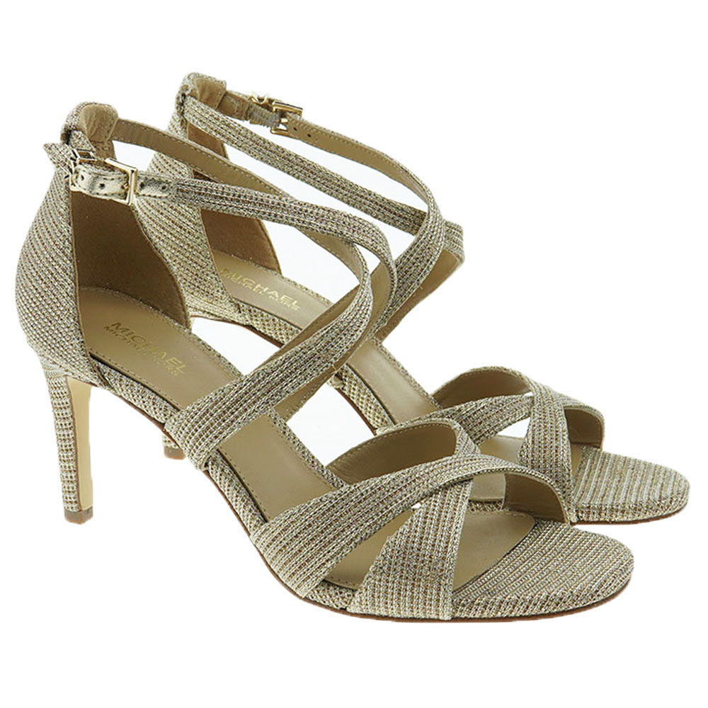 Estas andalias de Michel kors nos las pondremos en fiestas y ceremonias este verano. Estaán fabricadas en piel metalizada con cierre dehebilla al tobillo para mayor comodidad y sujección. En la parte del empeine tiene unos detalles. La altura del tacón es 7,6 cm aproximadamente