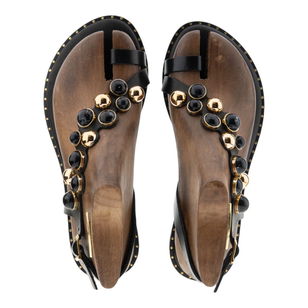 Las sandalias griegas mujer Caryatis destacan por su diseño sofisticado con esferas doradas y negras, fabricadas artesanalmente en Grecia.