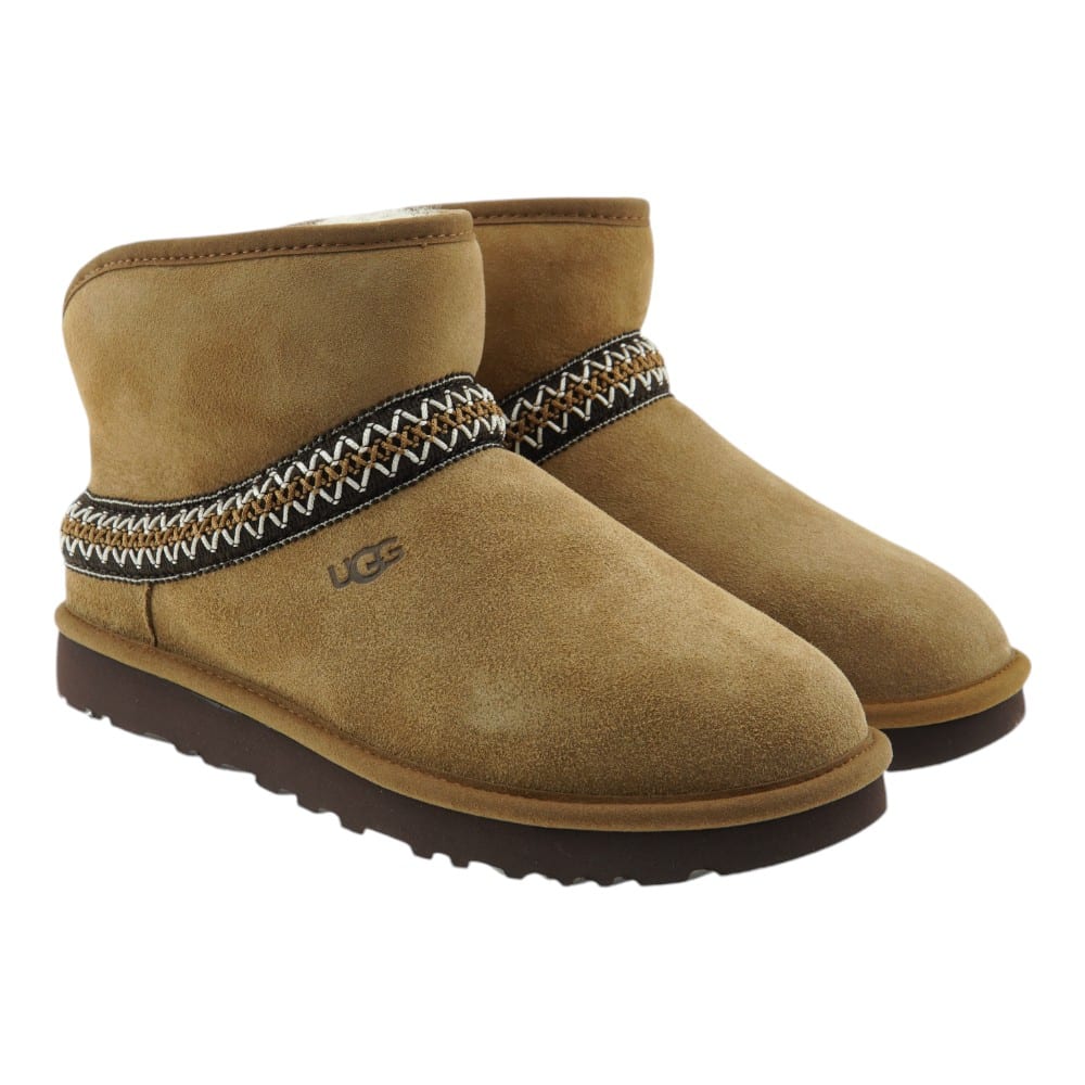 Las botas mujer Ugg Classic Crescent en color cuero son la elección perfecta para un look casual y cálido. Este modelo destaca por su banda bordada inspirada en el estilo boho, que añade un toque único al clásico diseño de Ugg. Fabricadas en ante resistente, estas botas cuentan con un forro de lana de oveja que asegura calidez y confort en cada paso. Su suela de goma antideslizante proporciona estabilidad, convirtiéndolas en una opción ideal para el invierno.